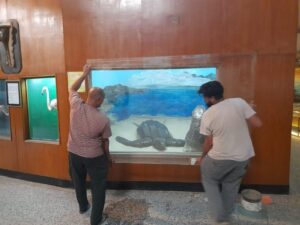 ‏‎ضمن سلسلة النشاطات الفنية والعلمية وبدعم وتوجية من مدير المركز ا.م.د. هناء هاني الصفار واشراف أ.د. رزاق شعلان عكل التدريسي في قسم الحشرات واللافقريات بالمحافظة على النماذج المخزونة في قاعة معروضات المتحف ، وادامة الخزانات قام المدرس وعد عدنان محمود التدريسي في قسم النبات والبيئة باعادة صيانة وتأهيل بعض النماذج في الخزانات الخاصة السلحفاة وادامتها وفق الفن الحديث من خلال اضافة لمسات تحاكي التطور الفني والعلمي وتعتبر من اهم اللمسات الفنيه والعلميه التي تم ادخالها لقاعة المعروضات.